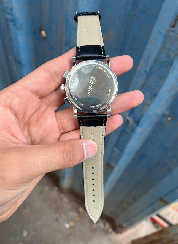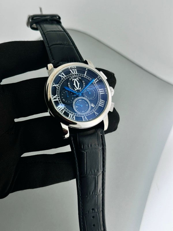 Step into bold luxury with the Cartier 007 All Black Premium Chronograph (inspired edition). Featuring a deep black dial with functional chronographs, copper detailing, and a rich brown leather strap, this timepiece merges rugged performance with refined design.