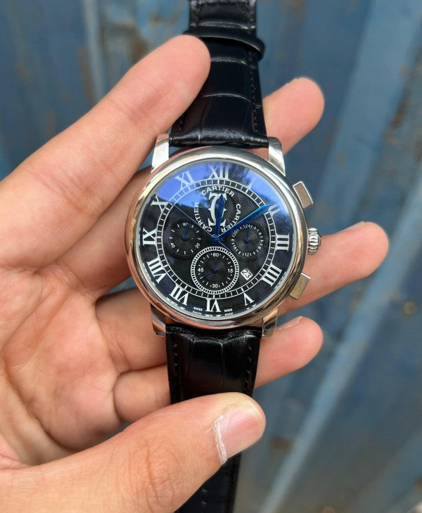 Cartier 007 All Black – Chronograph with Brown Leather Strap