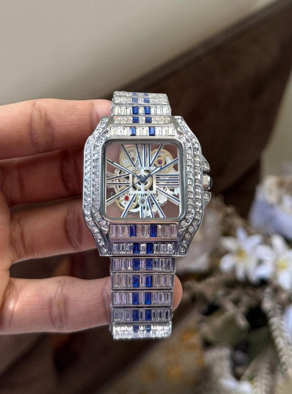 Cartier Santos Skeleton Blue Diamond Quartz Watch