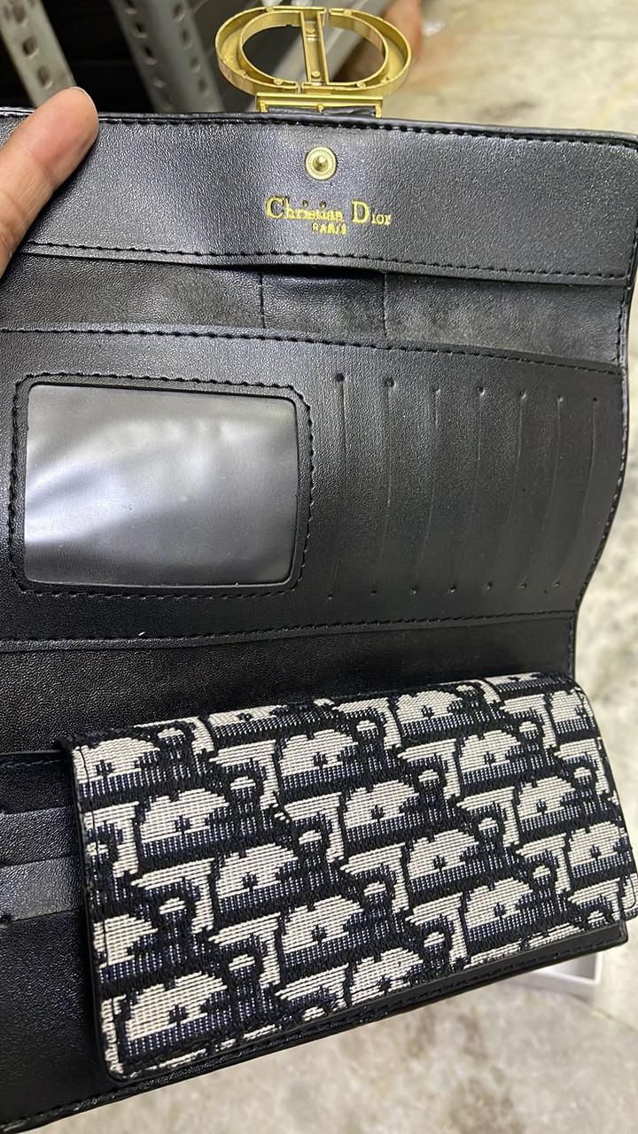 A sleek and elegant tri-fold wallet featuring the classic CD emblem, designed with a spacious card organiser for everyday convenience.