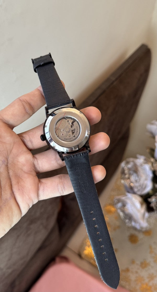 Emporio Armani Meccanico – Black Leather Automatic WatchTimeless elegance meets mechanical artistry in the Emporio Armani Meccanico (inspired edition). Designed with a sleek black leather strap and a precision automatic skeleton dial, this premium piece reflects the signature style of the Armani legacy.