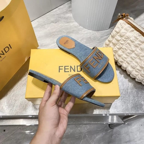 Fendi Denim Logo Flats With OG Box & Carry Bag