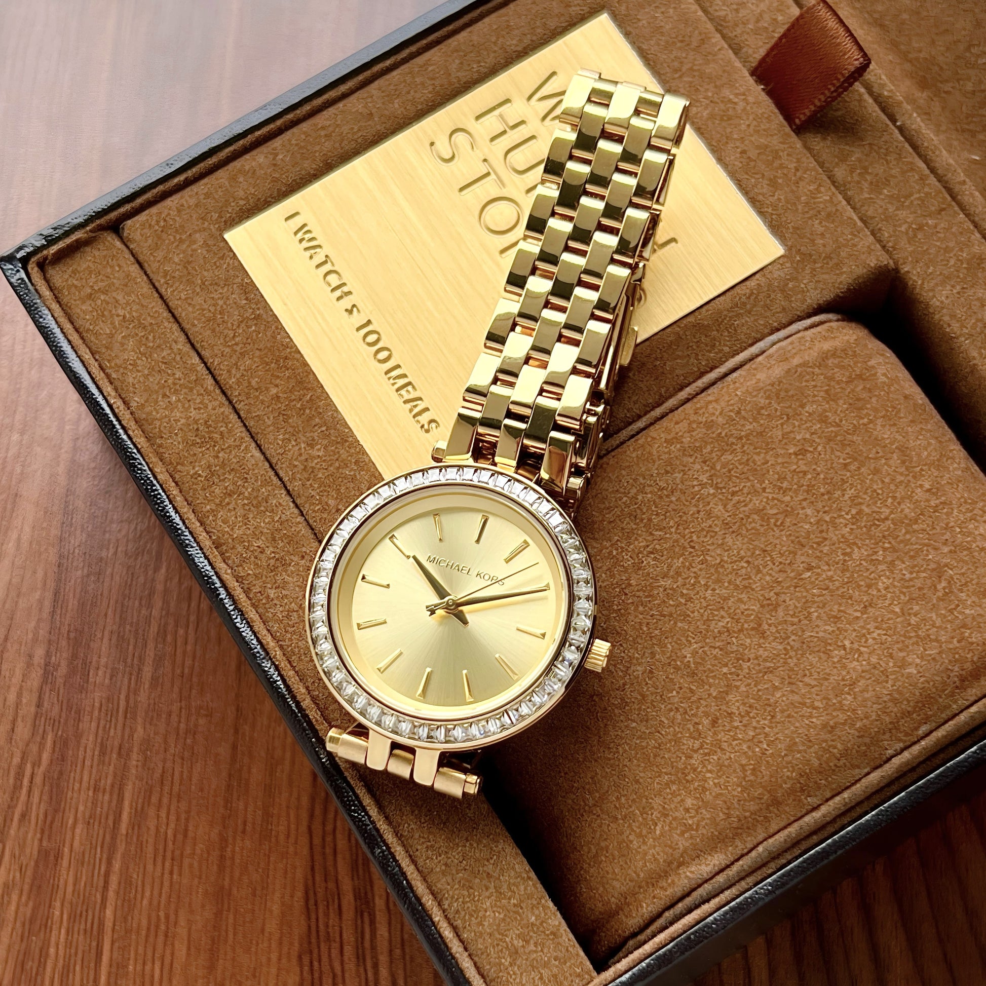 Upgrade your accessory game with this Michael Kors Mini Darci Gold Watch, a radiant timepiece designed for those who appreciate timeless elegance and modern flair. Crafted from 7AA Premium Stainless Steel, the watch features a sleek 32mm gold dial, a dazzling Swarovski-studded bezel, and a refined gold-tone bracelet. Whether for daily wear or special occasions, this watch is a versatile companion that makes a statement.