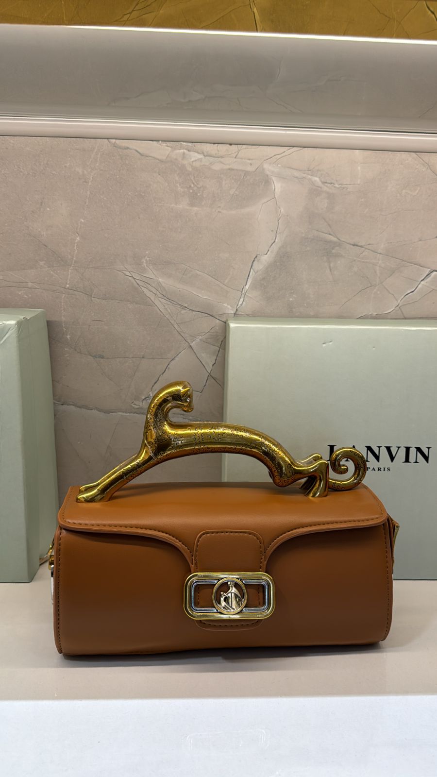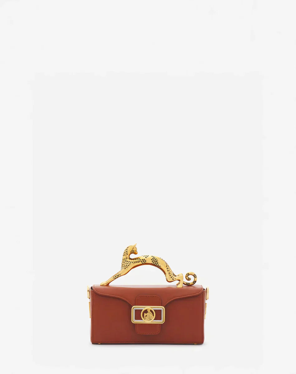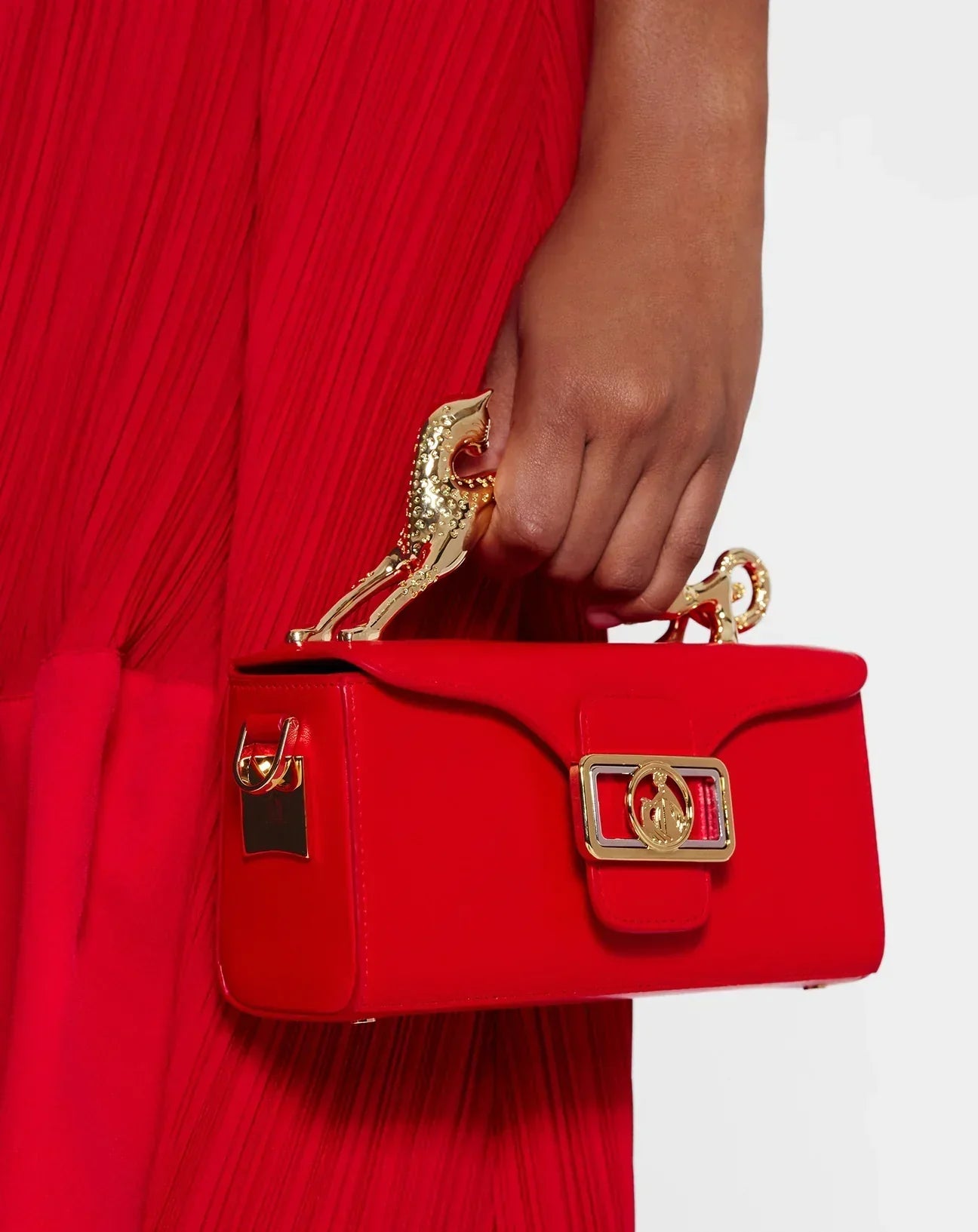 This distinctive bag is adorned with a sculptural jewelry handle, drawing inspiration from an andiron owned by Lanvin.