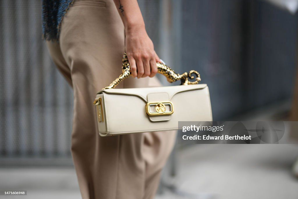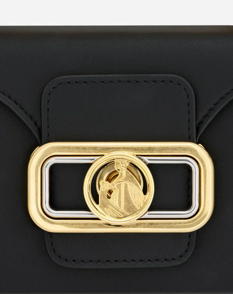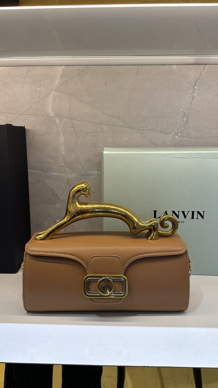 This distinctive bag is adorned with a sculptural jewelry handle, drawing inspiration from an andiron owned by Lanvin.