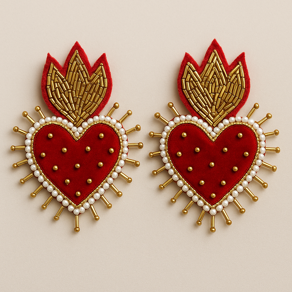 Unveil your bold yet tender-hearted side with our Red Velvet Heart-Shaped Earrings. Handcrafted to perfection, these striking statement earrings are adorned with rich red velvet textures and gleaming gold beadwork. Designed to dazzle, they reflect strength, confidence, and heartfelt charm — making them the perfect everyday accessory for those who love to stand out with intention and grace.