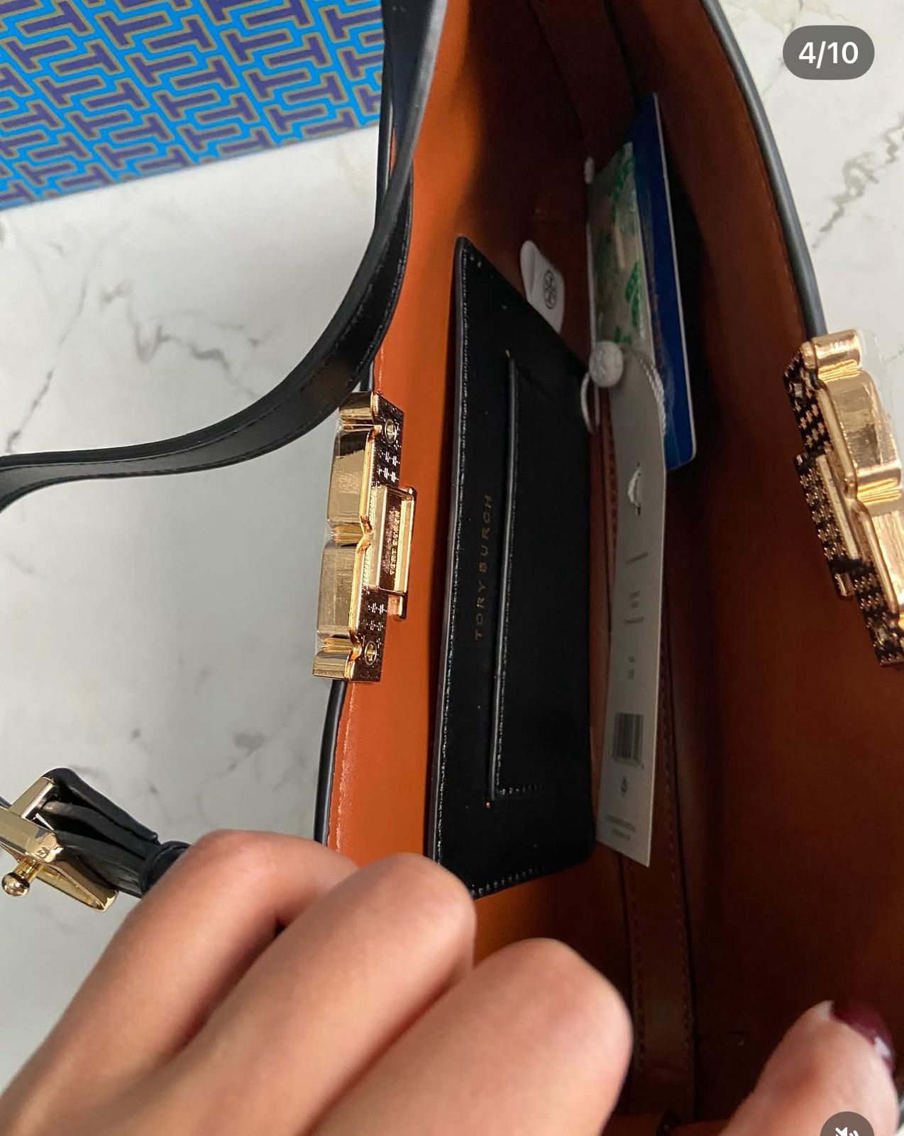 Features Tory Burch logo magnetic flap for secure closure