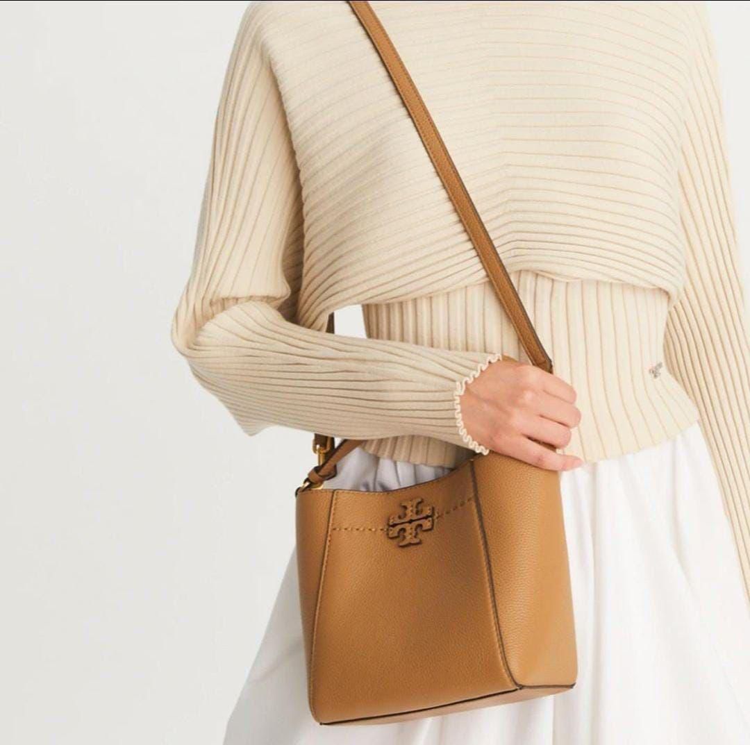 Sleek and structured bucket silhouette with signature Tory Burch detailing